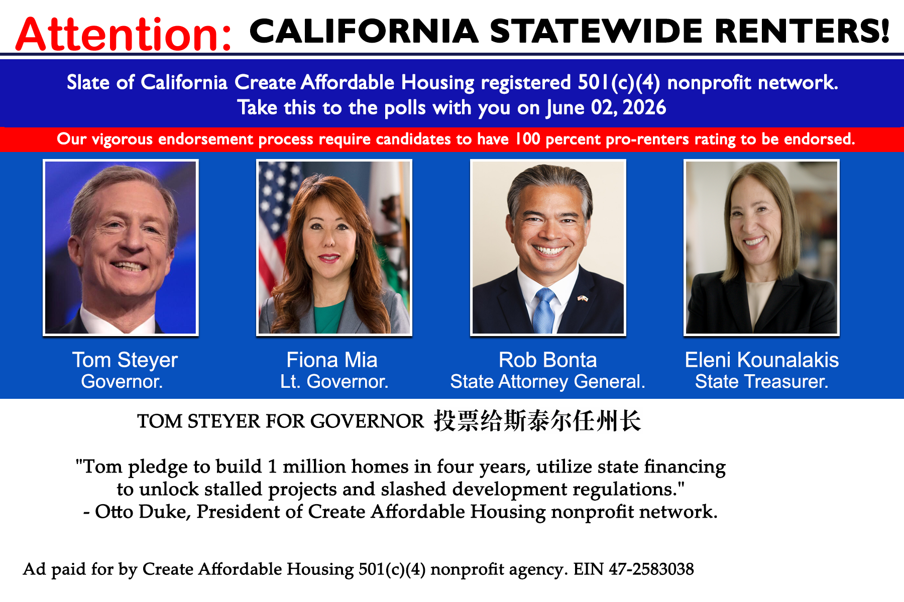 The California Create Affordable Housing Network nonprofit organization mission is to increase the supply of safe, stable and affordable homes for low-income residents, families and vulnerable communities through financing, policy advocacy and development. Our aim is to prevent homelessness, curb displacement and advance racial equity by expanding housing access across the state. California Create Affordable Housing Network nonprofit organization endorse political candidates who demonstrate a strong commitment to increasing housing supply and streamlining the development process.
